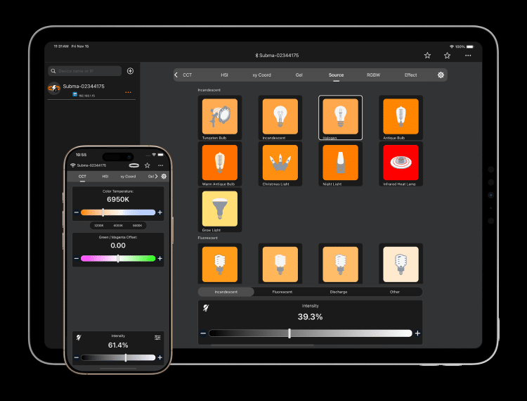 - Match daylight / tungsten fixtures or anything in between via the Correlated Colour Temperature controls