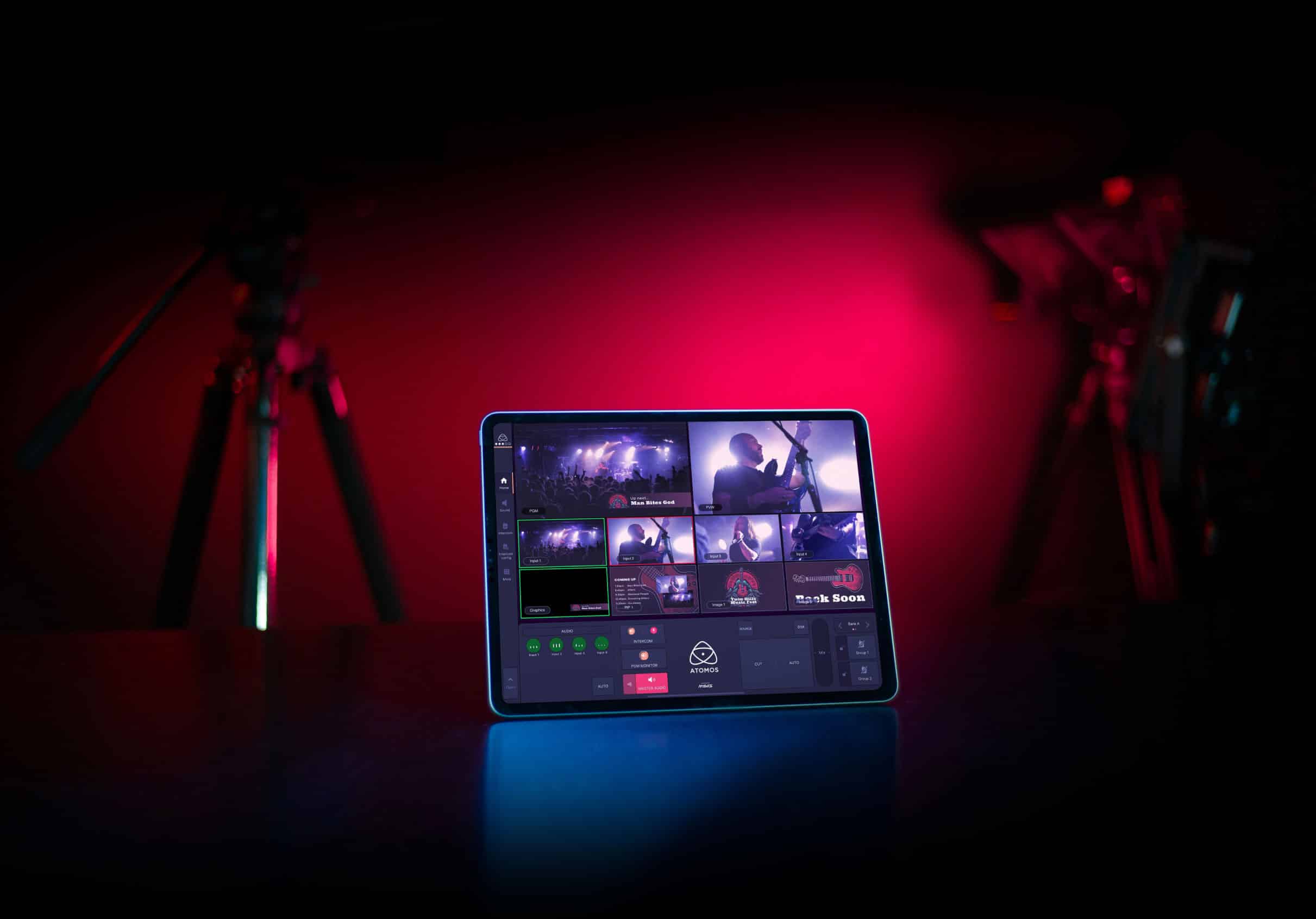 The Atomos – Surface app for iPad features all the tools running in the cloud that you need to create a polished live production. Features include a video switcher for up to 8 inputs, a sound mixer for up to 32 channels, 2 x VT Players, 8 x DVE, 8 x frame players, transitions, HTML5 graphics, still images, PiPs and a fully integrated global talkback/intercom system, available as an iOS app called Atomos – Surface and directly on the Atomos device.
