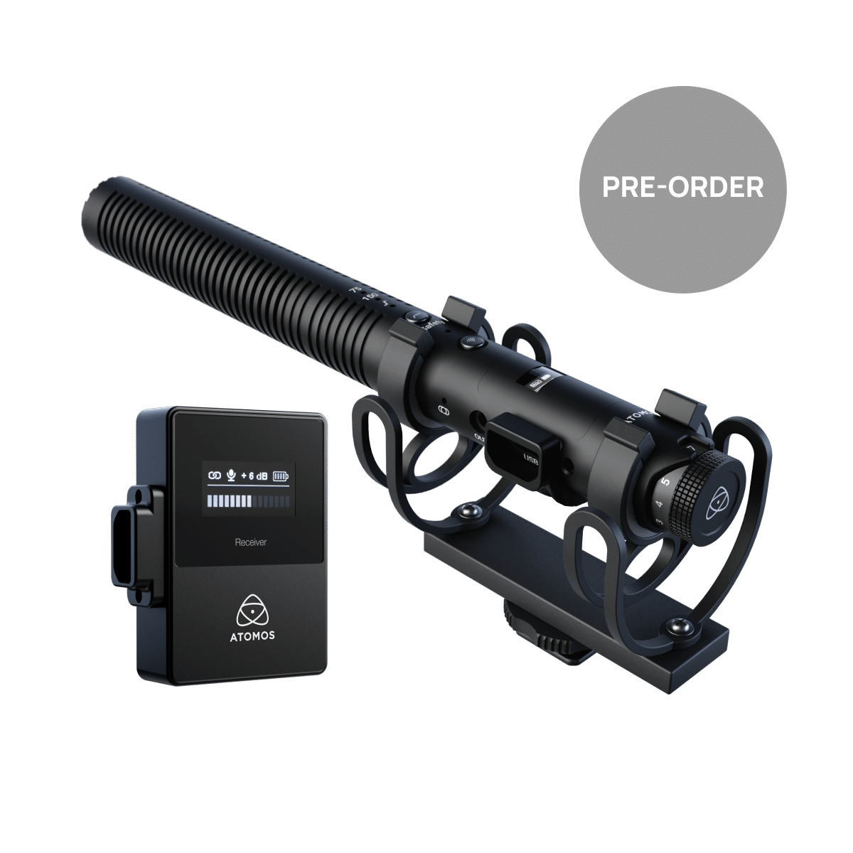 StudioSonic Shotgun Microphone, 2.4GHz RX receiver with USB locking connector, Atomos USB-C to USB-C locking cable, 3.5mm TRS cable, wind fur and foam shield, adjustable pole mount, Atomos Quick Release mount, premium Atomos case