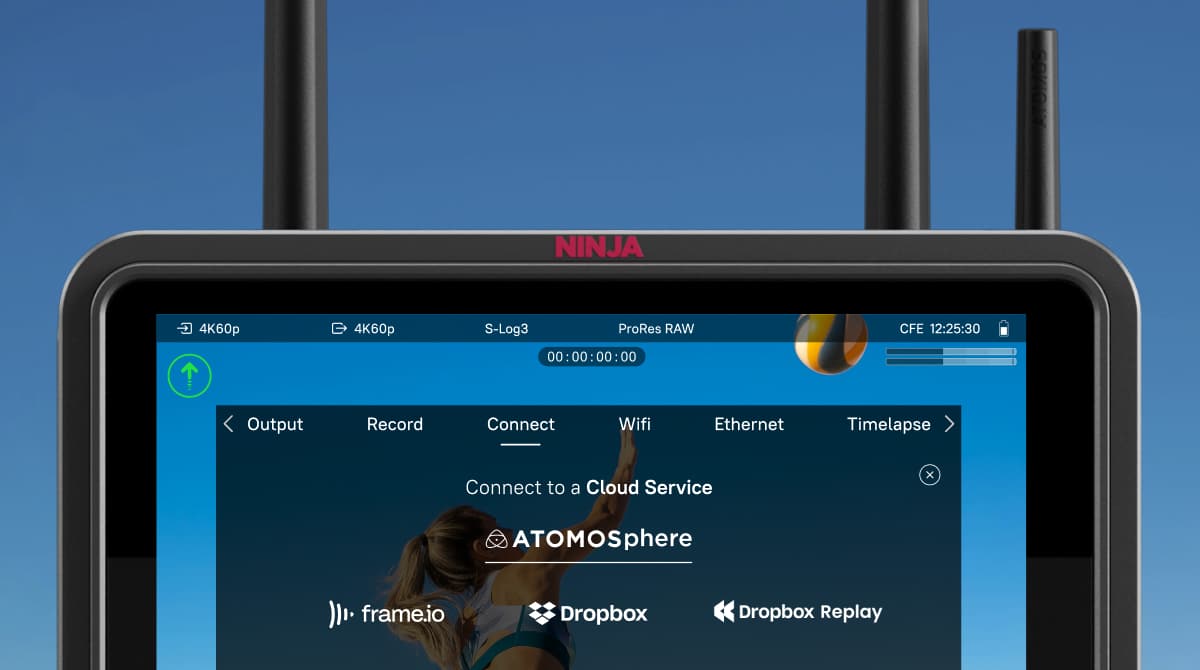 Camera to Cloud (C2C) is a revolutionary new workflow that allows you to upload your video files directly from your Atomos monitor-recorder to the cloud, right from wherever you’re shooting. There’s no time lost transporting and copying drives. Ninja TX has everything you need to do C2C built in, for Ninja and Ninja Ultra you need to add Atomos Connect, purchased separately. Atomos supports direct upload to our own cloud platform – ATOMOSphere – as well as third-party platforms, including Frame.io and Dropbox.