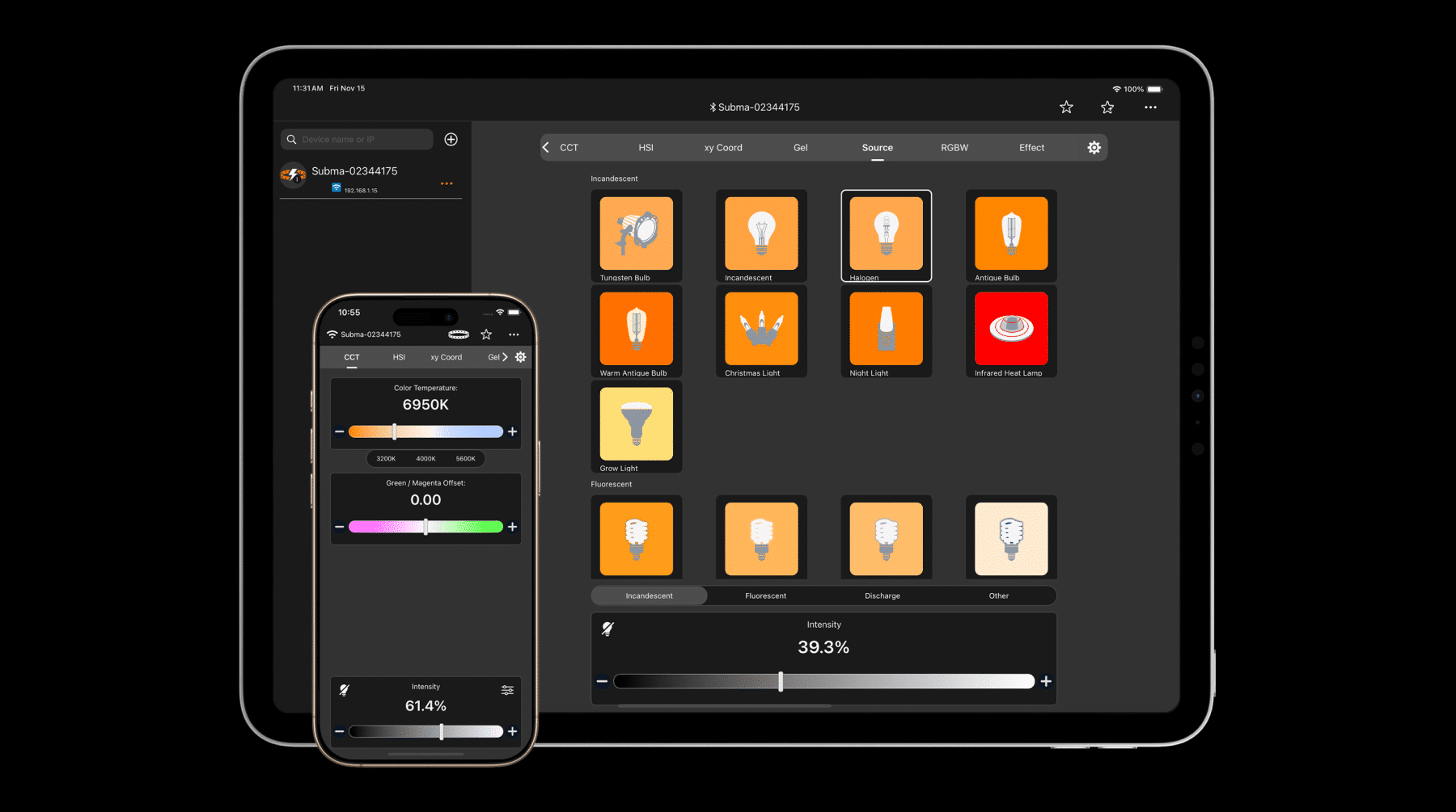 - Match daylight / tungsten fixtures or anything in between via the Correlated Colour Temperature controls