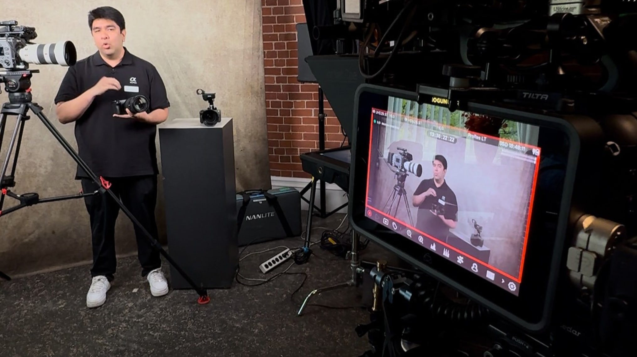 His primary rig features a Sony FX6 camera with a wide-angle lens, securely mounted on a Studio Titan America scissor camera stand for extra support. “I didn’t even know such a stand existed – it’s phenomenal. The moment I took it out of the box, I knew this would be my new rolling stand at trade shows. It’s incredibly stable and very easy to manoeuver,” he adds.