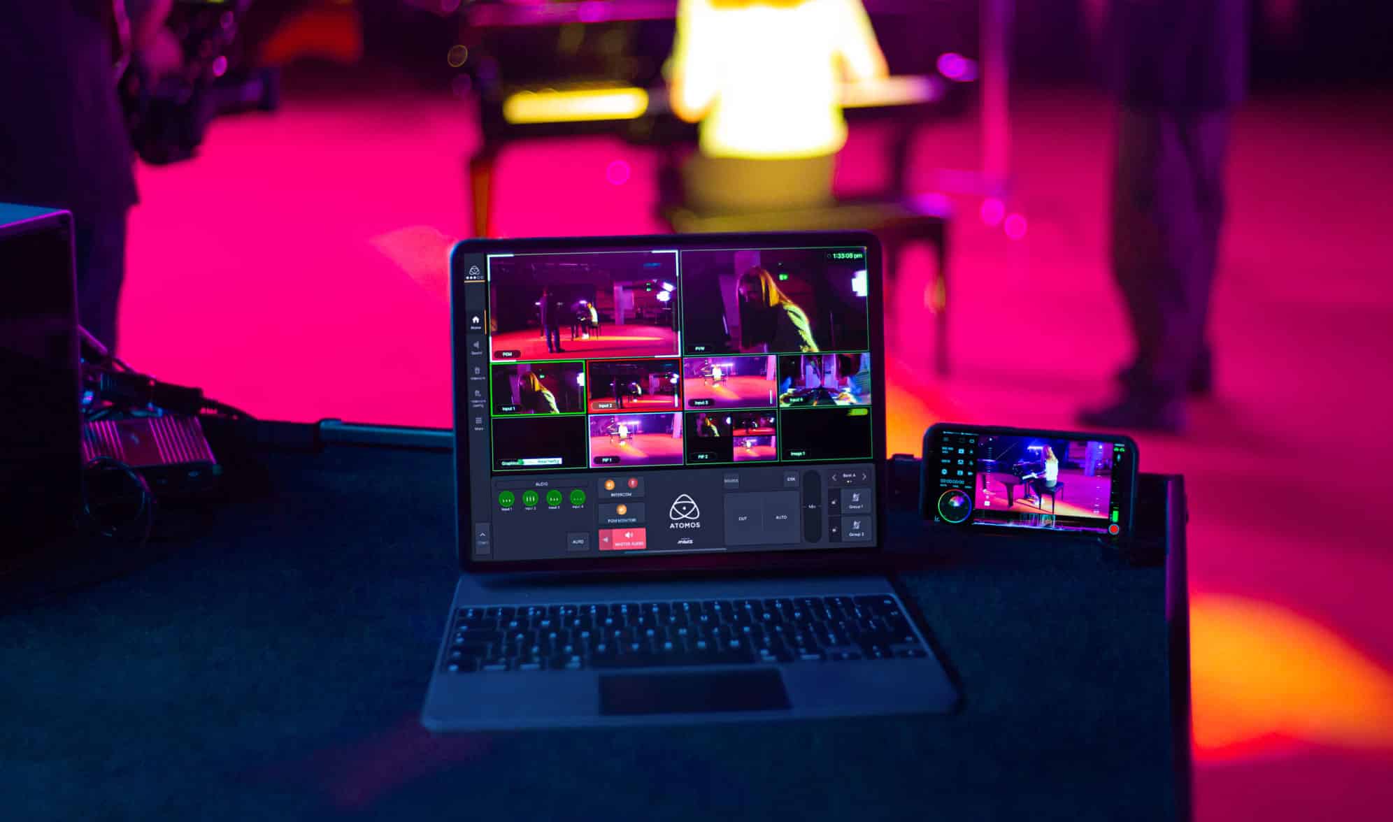 The Atomos – Surface app for iPad features all the tools running in the cloud that you need to create a polished live production. Features include a video switcher for up to 8 inputs, a sound mixer for up to 32 channels, 2 x VT Players, 8 x DVE, 8 x frame players, transitions, HTML5 graphics, still images, PiPs and a fully integrated global talkback/intercom system, available as an iOS app called Atomos – Surface and directly on the Atomos device.